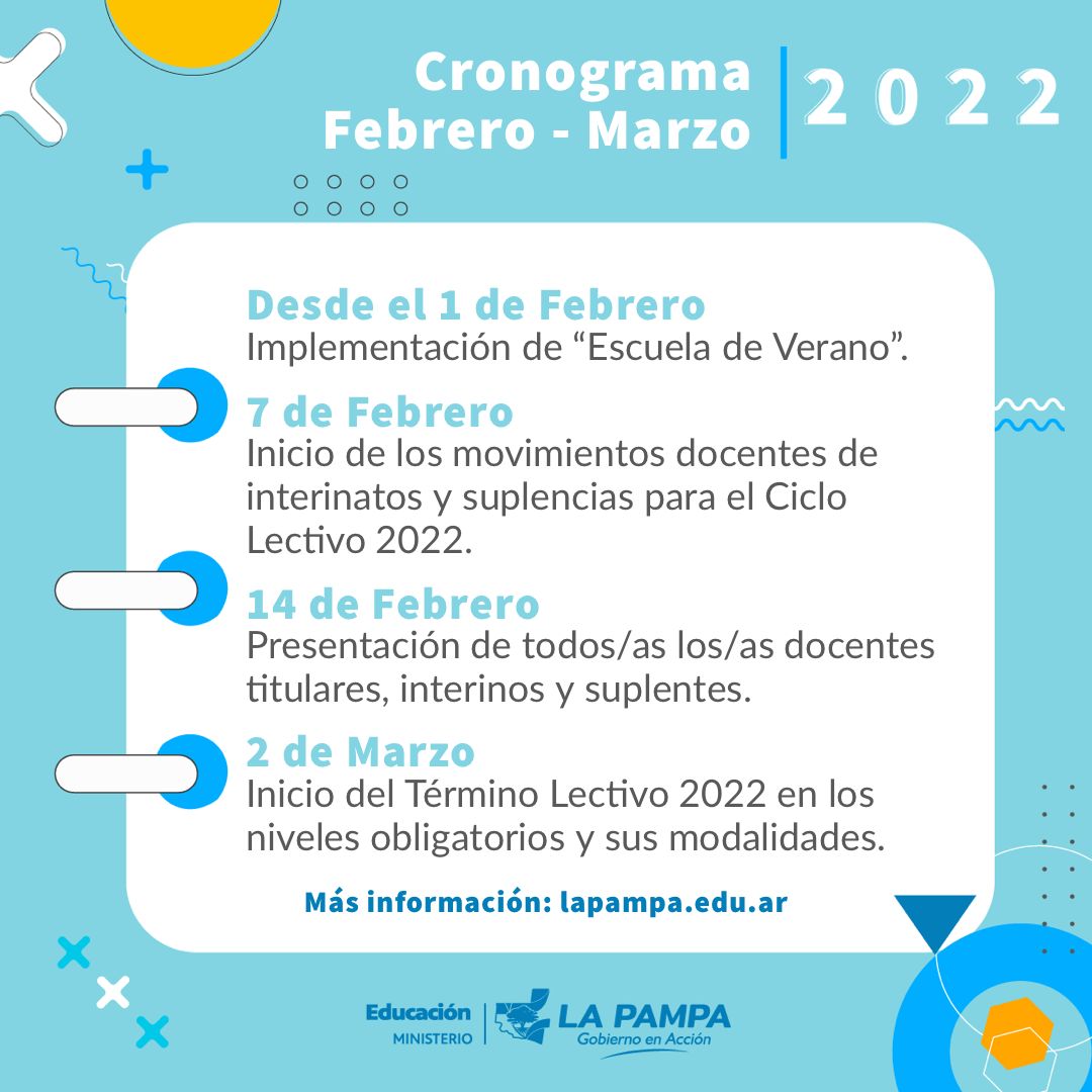 El Ministerio de Educación de La Pampa informó que se encuentra en la etapa final de elaboración del Calendario Escolar para el Ciclo Lectivo 2022 que regirá para las instituciones y los servicios educativos de todos los niveles y modalidades del sistema educativo provincial.