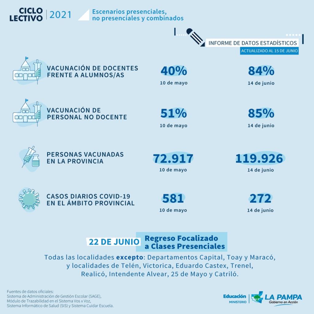 Durante la reunión, se expusieron datos estadísticos que respaldan la decisión acordada por el Gobierno provincial. Dentro de ellos, se informó que – al 10 de mayo inclusive – 72.917 era el número de personas vacunadas contra la COVID-19 en la Provincia. Al 14 de junio, el plan de inmunización alcanzó a 119.926 personas. A su vez, se detalló que, el último día de clases presenciales en La Pampa – 10 de mayo – se registraron 581 casos positivos en el día a nivel Provincial. Al 14 de junio, ese número descendió a 272 personas diarias.